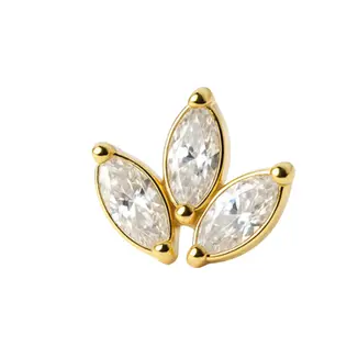 Son zircon blanc taillé en marquise, monté en trio, apporte une touche raffinée et lumineuse. Le filetage interne garantit une pose douce, limitant les frottements et protégeant le canal du piercing.